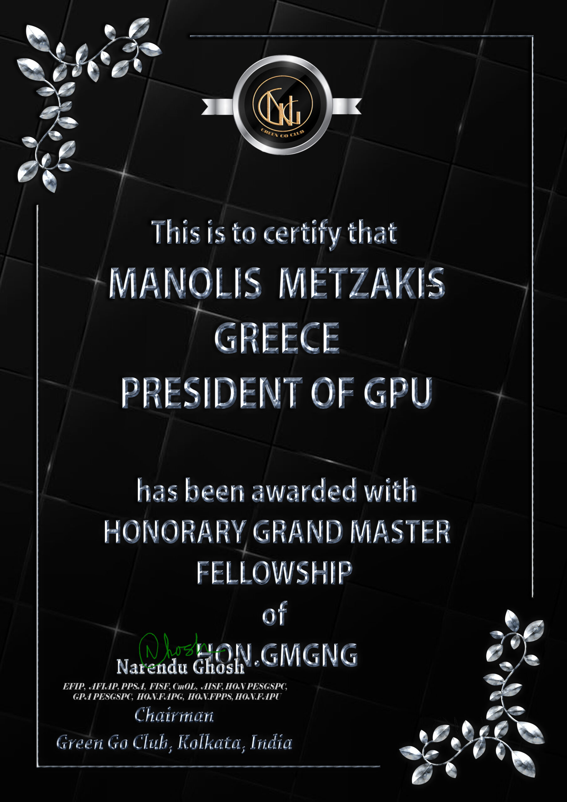Awarded in India with the club’s highest honor Hon.GRAND MASTER GNG in recognition of the personal achievements in international photography and the extensive supportive contributions to the advancement of the art of photography in general and to the club GNG!