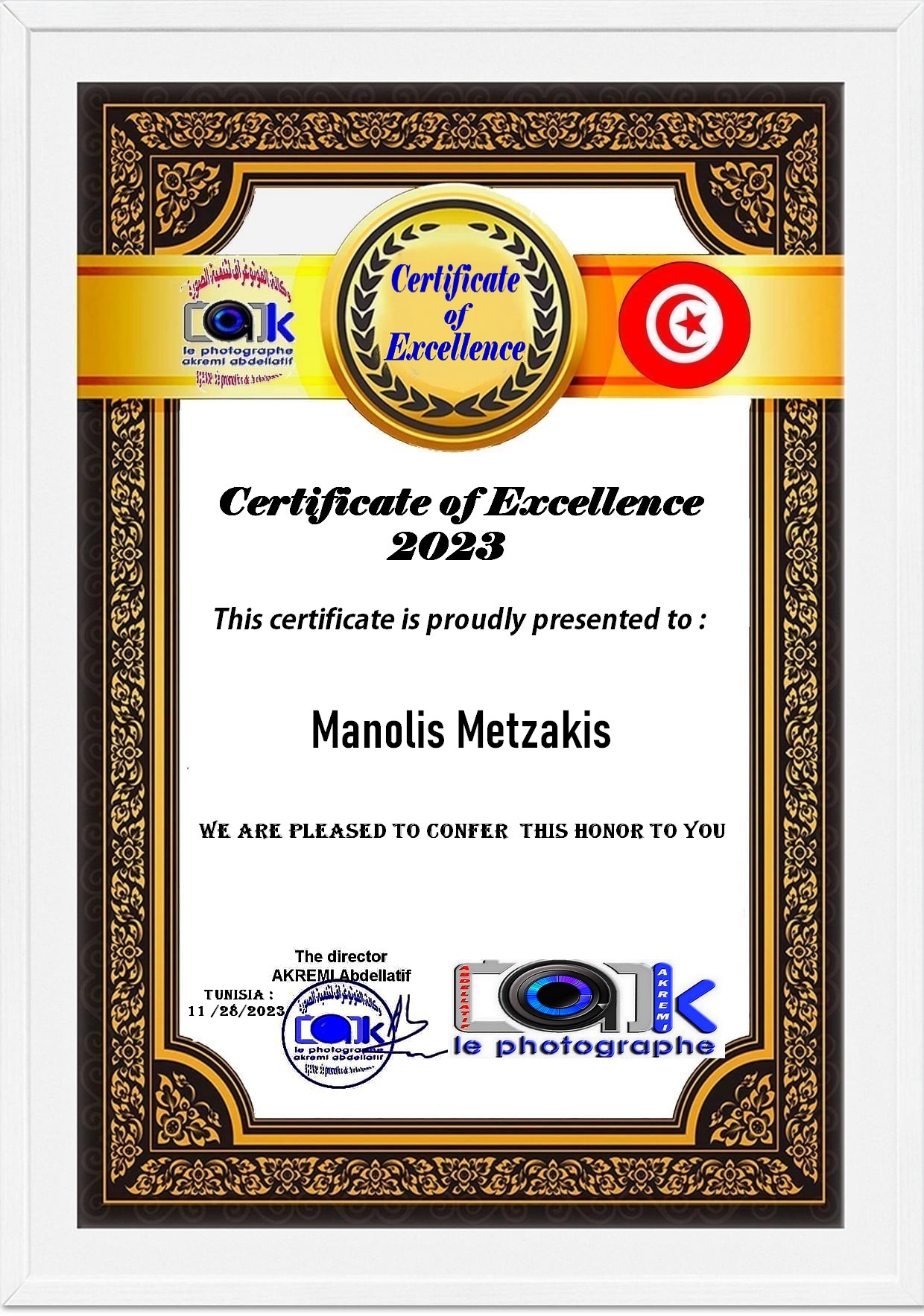 Awarded with the Honorary Title from Tunisia: “Fellowship of Master Artemis”Certificate of Excellene 2023” in recognition of the personal achievements in international photography and the extensive supportive contributions to the advancement of the art of photography!