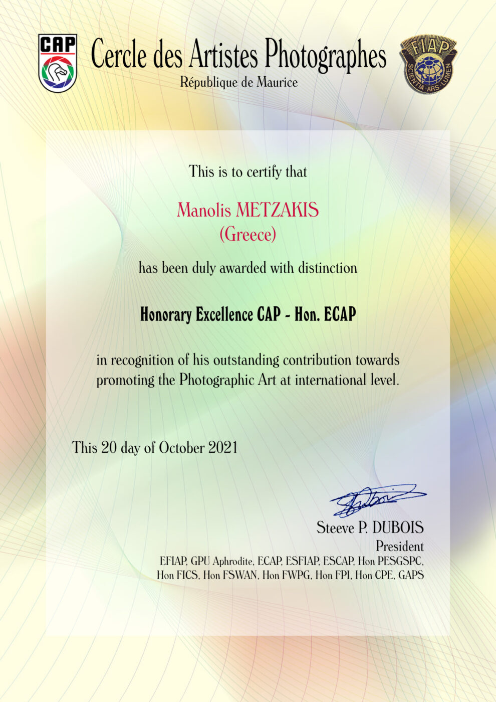 The Cercle des Artistes Photographes from the island of Mauritius, have the great pleasure to award Metzakis Manolis the distinction “Honorary Excellence CAP – Hon ECAP” for his efforts in the promotion of the art of photography.